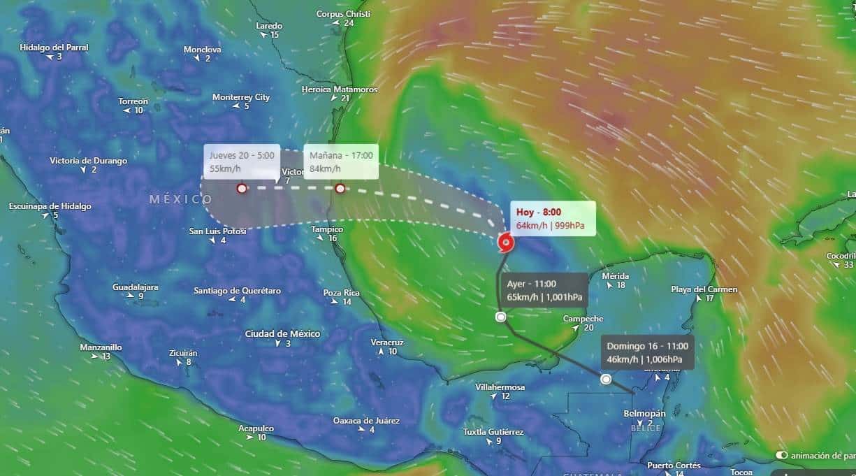 • Se espera que a las 0:00 horas del miércoles, el ciclón evolucione a tormenta tropical, y que impacte en las costas de La Pesca, Tamaulipas, en las primeras horas del jueves 20 de junio.