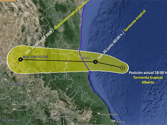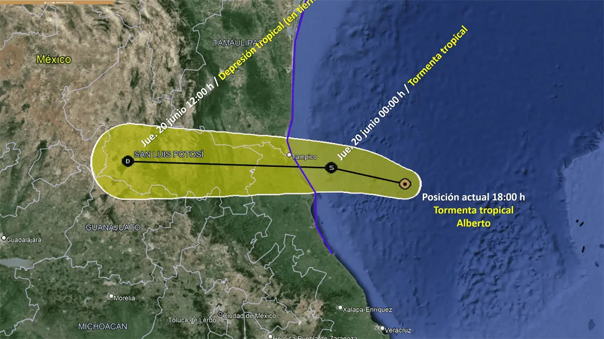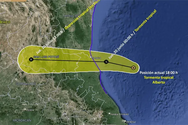 A las 18:00 horas de este miércoles (tiempo de México), «Alberto» se encontraba a 180 km al este-noreste de Cabo Rojo, Veracruz, y a 240 km al este-sureste de Tampico, Tamaulipas.