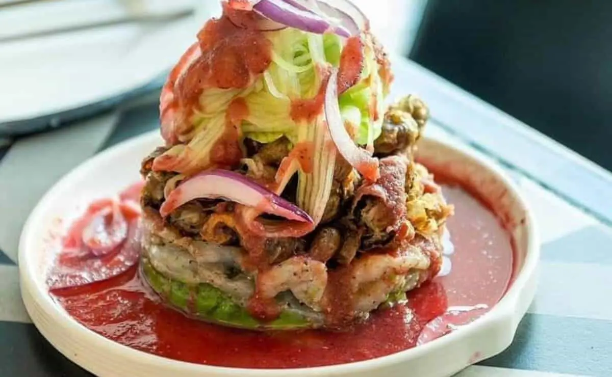 La base del platillo es una cama de aguacate fresco, seguida de camarones curtidos en limón y el ingrediente estrella, la tripa bien dorada, que aporta una textura crujiente y un sabor distintivo.