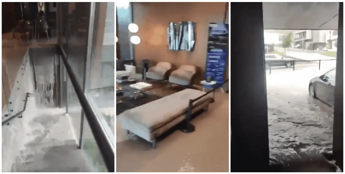 A través de videos que circulan en redes sociales, se logra observar cómo corre el agua desde el segundo nivel y por las escaleras, al tiempo que se observan los muebles completamente mojados.