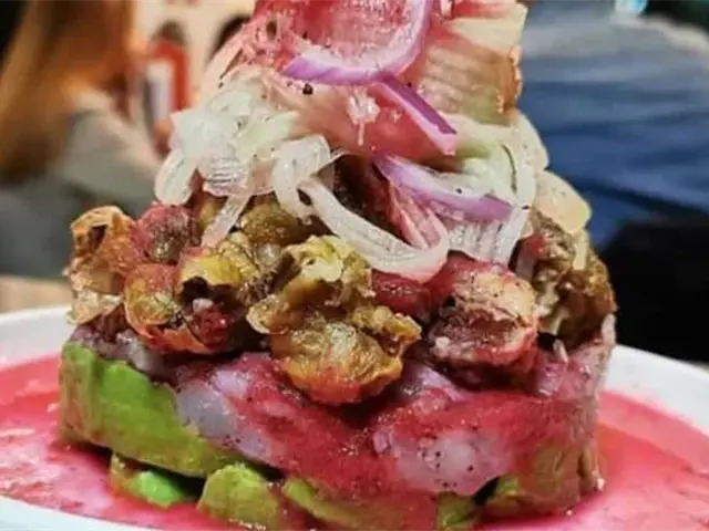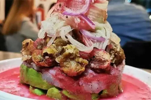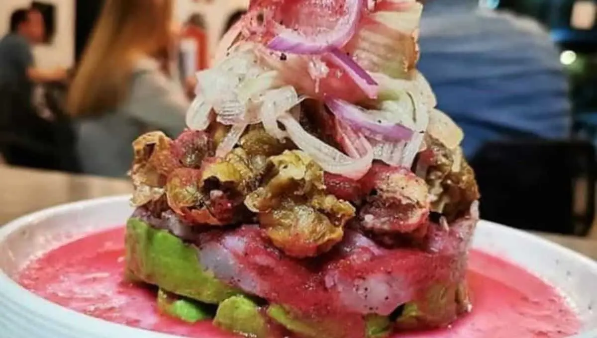 La base del platillo es una cama de aguacate fresco, seguida de camarones curtidos en limón y el ingrediente estrella, la tripa bien dorada, que aporta una textura crujiente y un sabor distintivo.