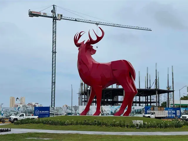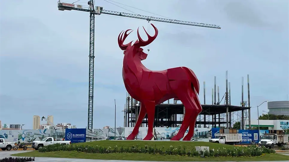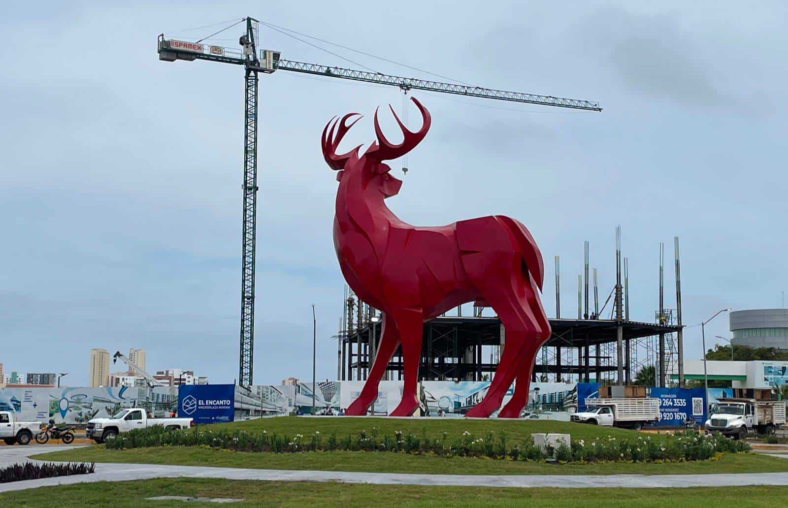 Con un fuerte e imponente color rojo, luce a pocas horas de ser develado formalmente por autoridades, el venado de la glorieta de Paseo del Atlántico y Carlos Canseco, en el sector La Marina de Mazatlán.