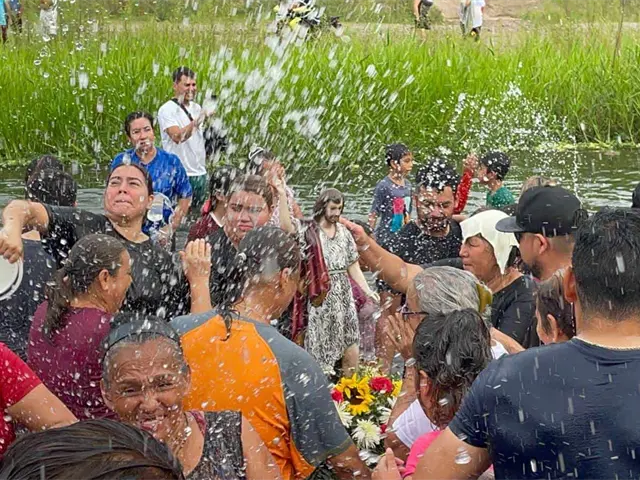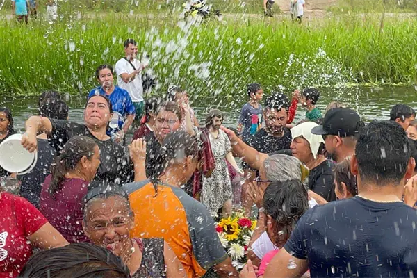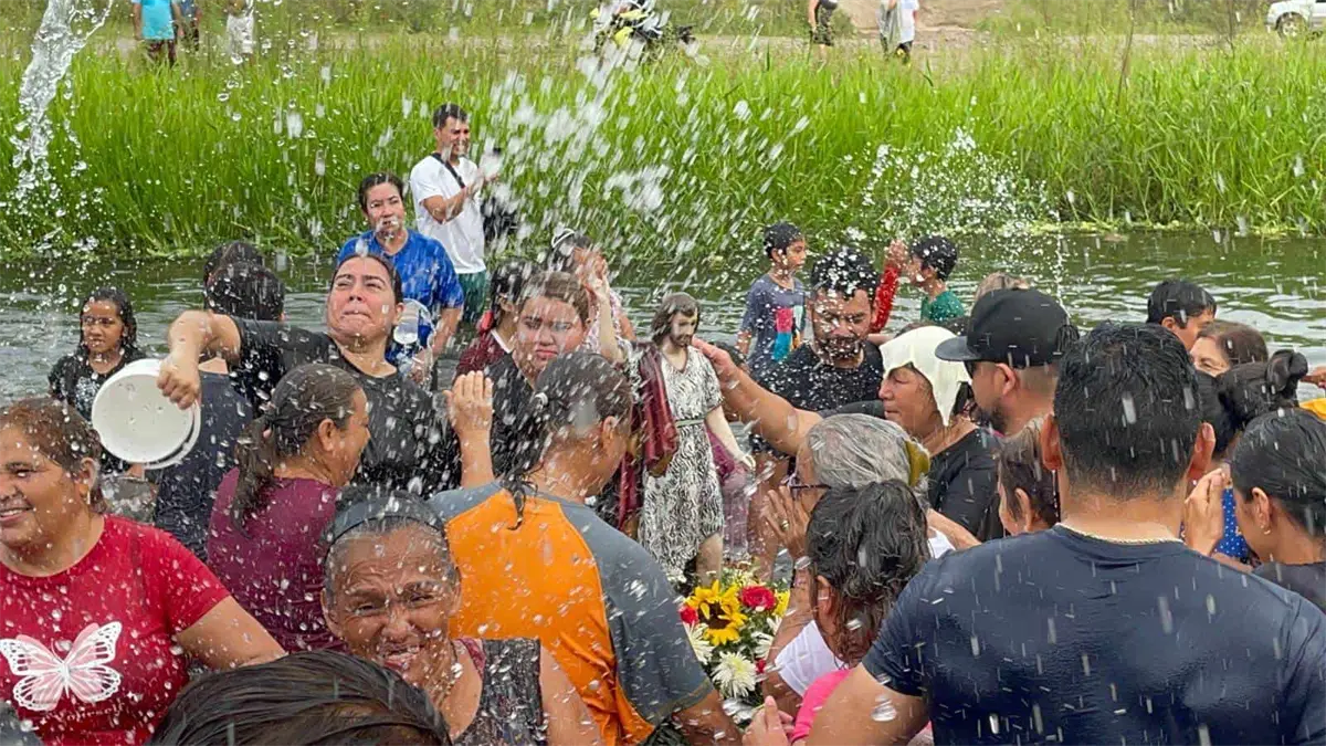 - Ahí, la comitiva que cargó el santo entro hasta el cauce del cuerpo de agua para dar inicio al baño de San Juan Bautista, en una representación del bautismo para todos los feligreses y que con el agua, llegué la bendición de Dios y que se verá reflejada en abundantes aguas en esta temporada de lluvias.