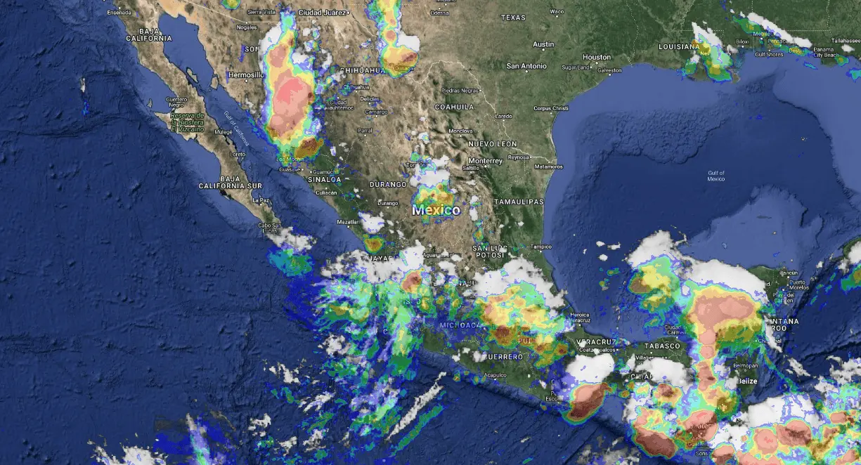 Para esta noche y madrugada del miércoles, canales de baja presión, el primero extendido desde el noroeste hasta el centro del país y otro sobre el noreste del territorio nacional, en interacción una baja presión en altura frente a las costas de Jalisco y Michoacán, y con el ingreso de humedad de ambos litorales, originarán lluvias puntuales intensas en Nayarit, Jalisco, Colima, Puebla y Veracruz; lluvias puntuales muy fuertes en Michoacán, Guanajuato, Querétaro, Hidalgo, Tlaxcala, Estado de México y Guerrero; lluvias puntuales fuertes en Sonora, Sinaloa, Chihuahua, Durango, San Luis Potosí, Zacatecas, Aguascalientes, Ciudad de México y Morelos, además de intervalos de chubascos en Baja California, Baja California Sur, Nuevo León y Tamaulipas.