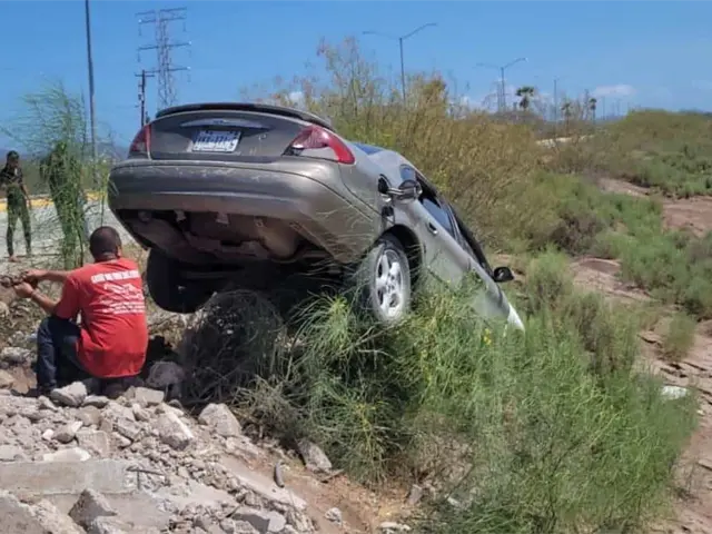El vehículo quedó con la parte frontal en el suelo a un costado de un montículo de escombros y los tres ocupantes del automóvil lograron salir por su propia cuenta sin requerir atención médica.
