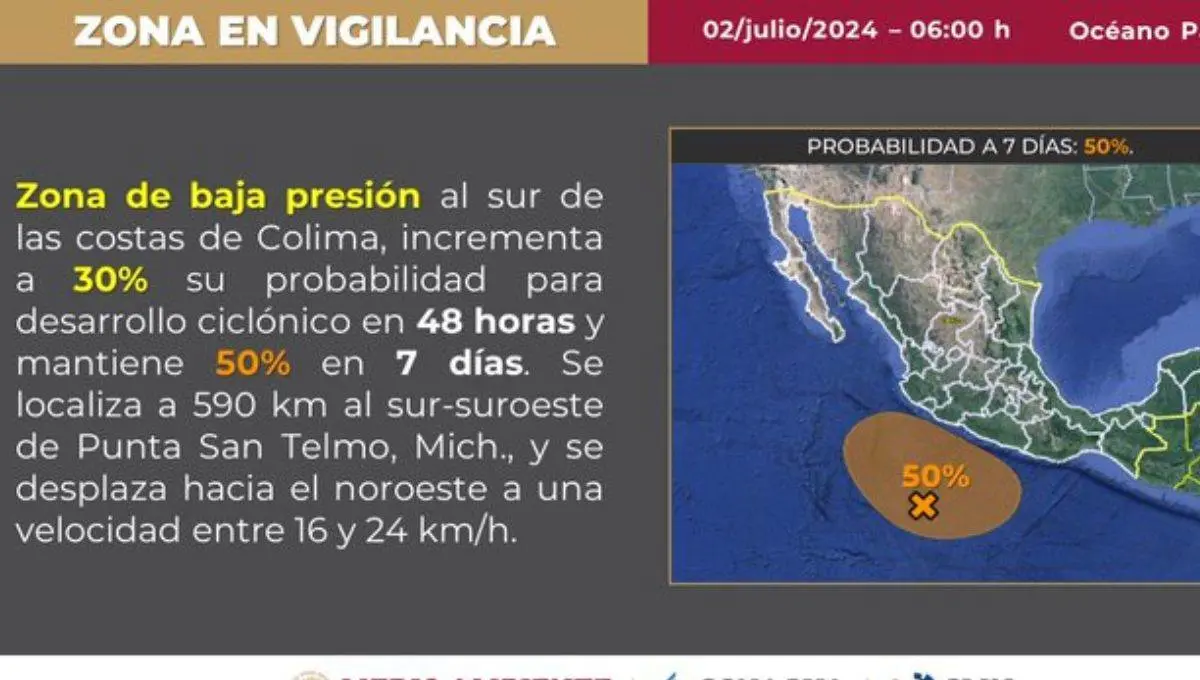 El Servicio Meteorológico Nacional (SMN) de la Comisión Nacional del Agua (Conagua) mantiene bajo vigilancia una zona de baja presión, con 50 por ciento de probabilidad de convertirse en el el primer Ciclón Tropical de la Temporada que llevaría por nombre «Aletta».