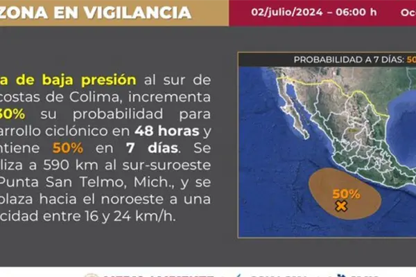 El Centro nacional de Huracanes (CNH) informó que los datos satelitales indican una amplia área de baja presión formándose frente a las costas de México. Este sistema estará provocando chubascos y tormentas eléctricas desorganizadas para Michoacán y Guerrero.
