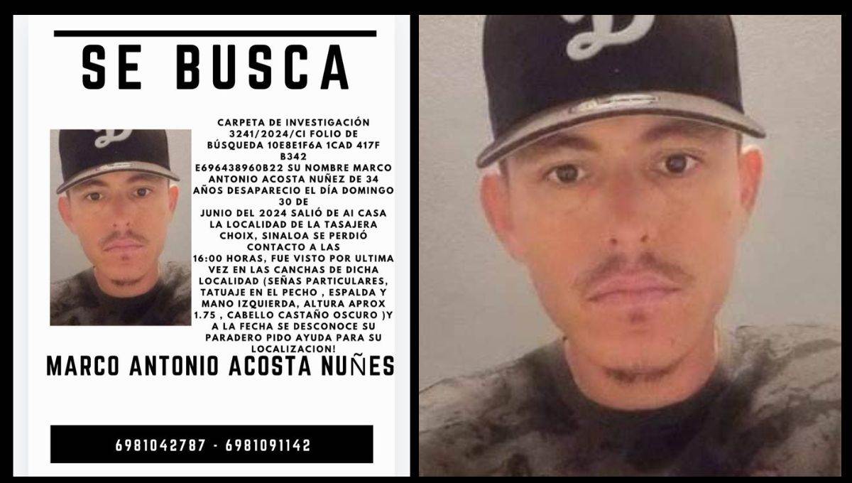 Se trata de Marco Antonio Acosta Núñez, un hombre joven de 34 años de edad, vecino de la comunidad de La Tasajera, y de quien hace cinco días su familia perdió todo contacto con él y 10 entonces desconocen de su paradero.