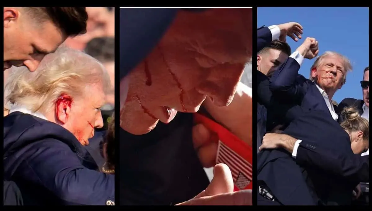 De acuerdo a los videos y fotos del momento exacto del ataque, se ve cómo Donald Trump sufre un razón en el rostro de un proyectil de arma de fuego durante su discurso y de pronto se desató el caos.