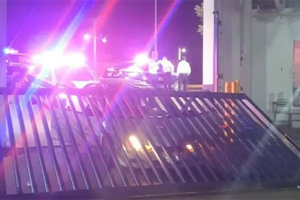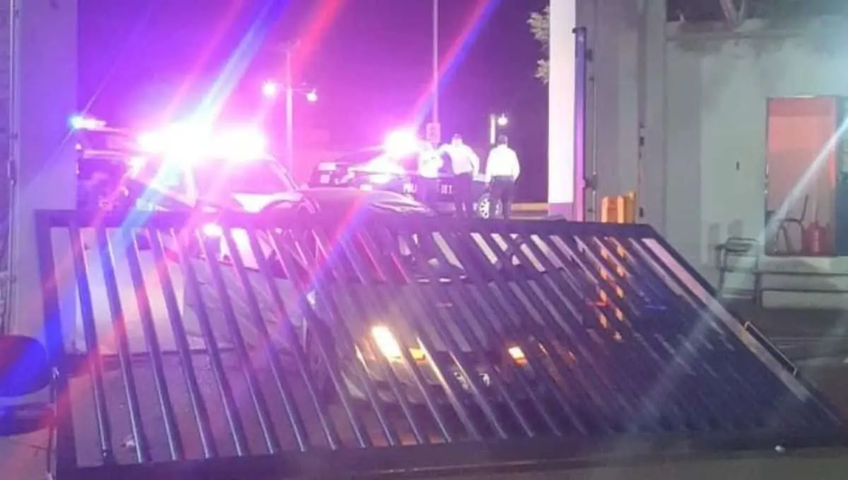 Los hechos ocurrieron cuando el conductor de un vehículo tipo sedán se estrelló contra el portón de acceso de la Policía Municipal y lo derribó en su totalidad, mismo que terminó sobre la unidad cerca de los ocupantes.
