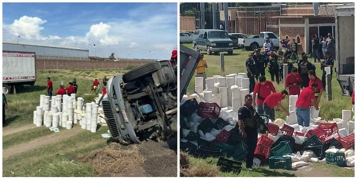 Un camión, tipo torton, cargado con varias toneladas de queso, volcó la tarde de este miércoles en la sindicatura de Gabriel Leyva Solano, en el municipio de Guasave, sobre la carretera internacional México 15.