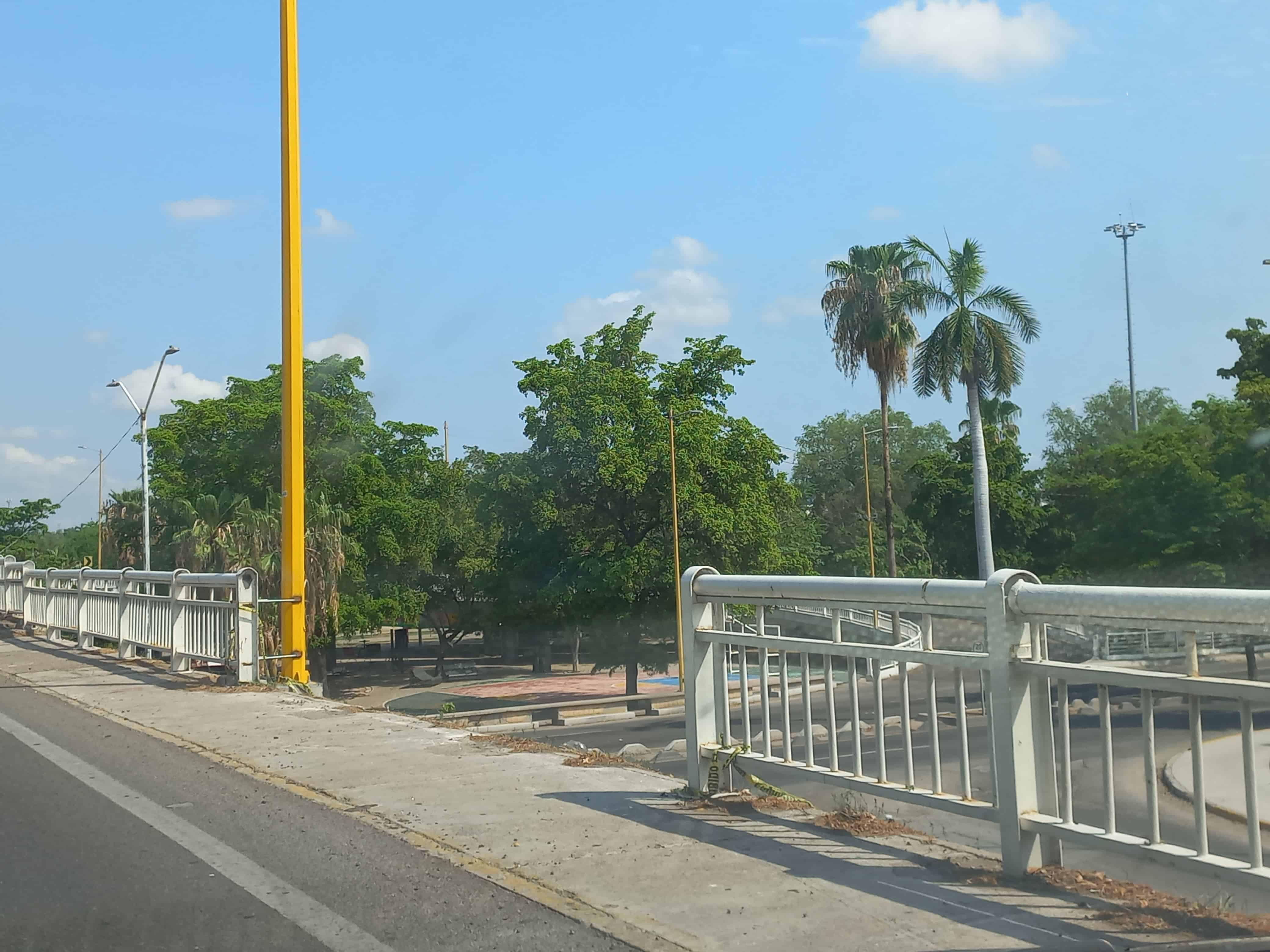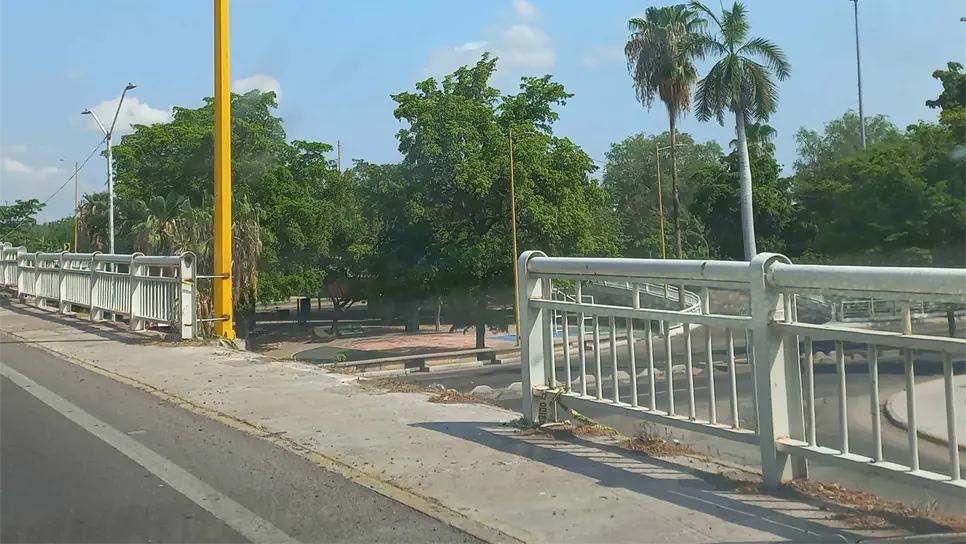 La falta del barandal de protección representa un peligro para los miles de automovilistas y transeúntes que a diario transitan por la zona, en un puente muy transcurrido de la capital sinaloense.