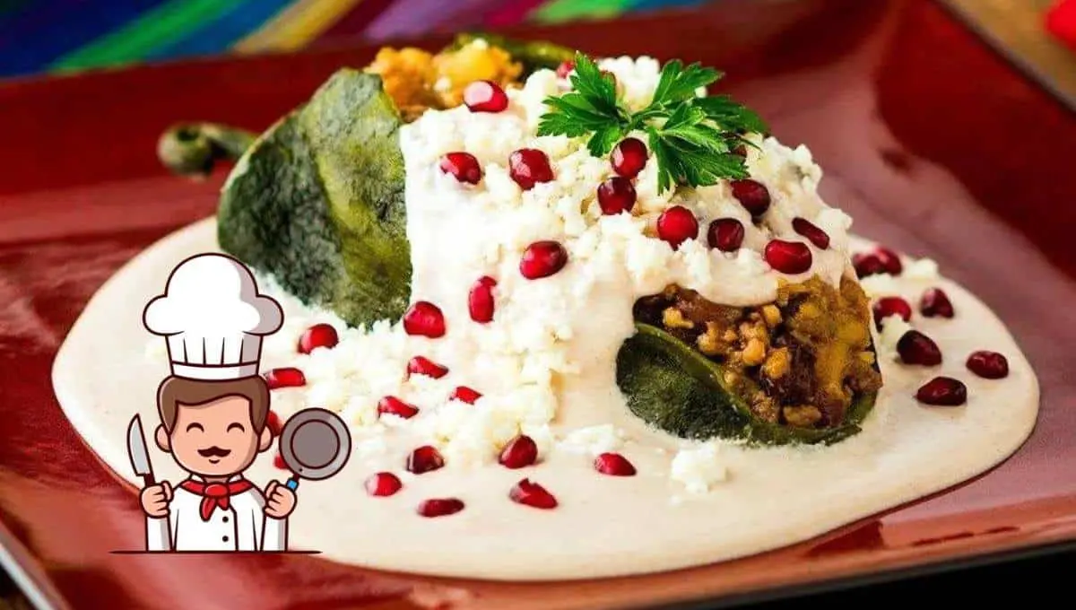 Se prepara con chile poblano, relleno de un guisado de picadillo y frutas, que incluye acitrón, y para finalizar, se cubre con crema de nuez de Castilla (nogada), hojas de perejil y granos de granada.