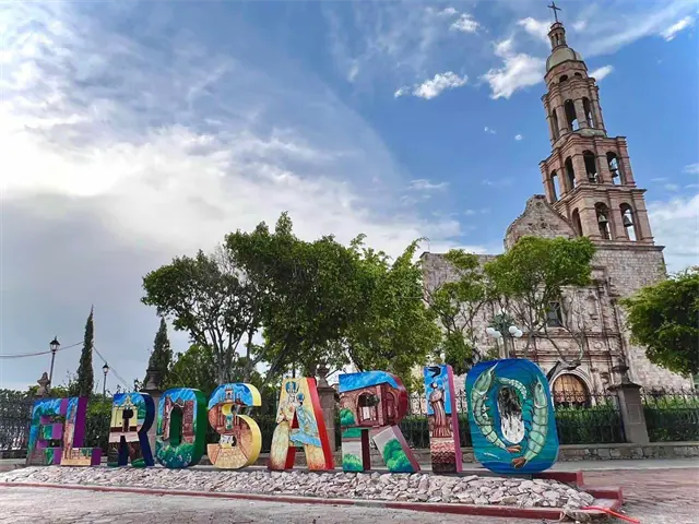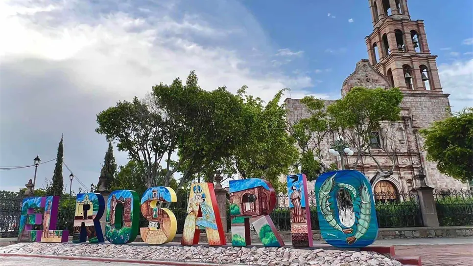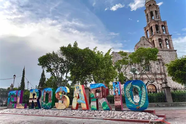 Cada letra está decorada con imágenes y elementos distintivos del municipio, reflejando su rica cultura y tradiciones.