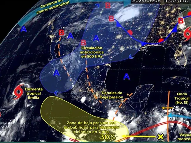 A su vez, un canal de baja presión se extenderá sobre la Mesa del Norte y el occidente del territorio nacional hasta la Mesa Central, en combinación con la entrada de aire cálido y húmedo proveniente del golfo de México y océano Pacífico, producirán lluvias puntuales muy fuertes en Jalisco, Michoacán, Guerrero y Oaxaca.