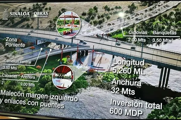 El «Mega malecón» en Culiacán tendrá 5. 2 kilómetros de recorrido y promete desfogar el caos vial al incluir gasas que conectarán con sectores que tienen problemas de circulación en horas pico, será una vialidad tipo bulevar con dos calzadas de 9 metros de ancho, tendrá un camellón central, ciclo vías y banquetas.