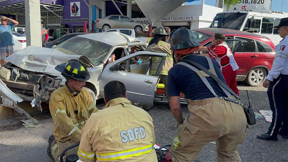 Cinco personas lesionadas, tres de ellas de consideración, fue el saldo de un aparatoso accidente registrado esta tarde en transitado crucero al sur oriente de la ciudad de Los Mochis, en donde una pareja de adultos mayores terminó prensada entre los fierros retorcidos de su vehículo.