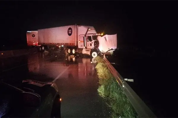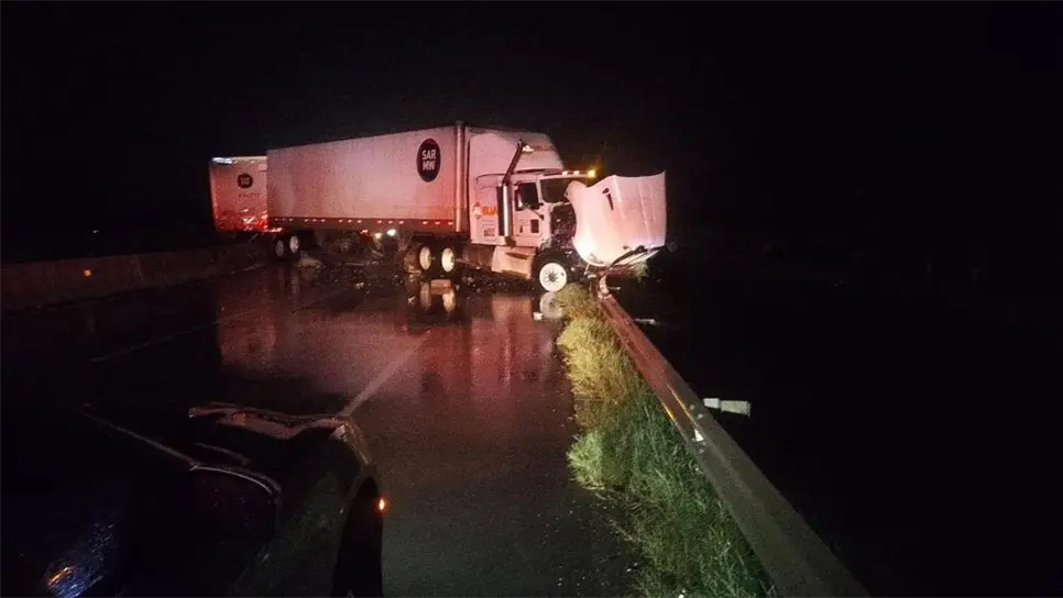 Se trata de un tractocamión que transportaba dos cajas refrigeradas, el cual presuntamente debido a lo mojado de la carpeta asfáltica derrapó y chocó contra el muro de contención.