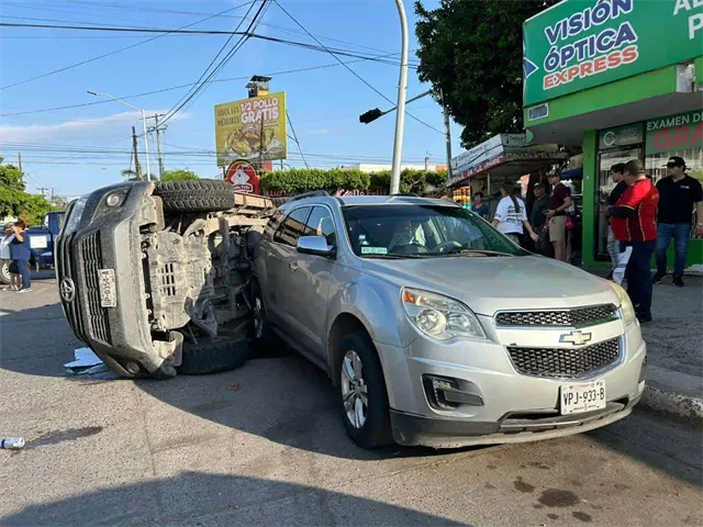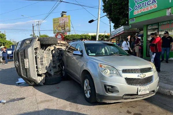 Tres personas con lesiones, una de ellas de gravedad, además de importantes pérdidas en daños materiales en dos vagonetas y una camioneta pickup, fue el saldo de un aparatoso accidente que terminó en volcadura en pleno centro de la ciudad de Los Mochis.