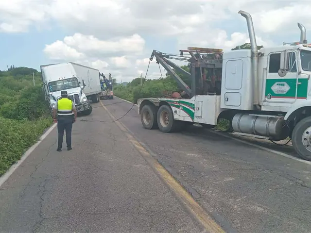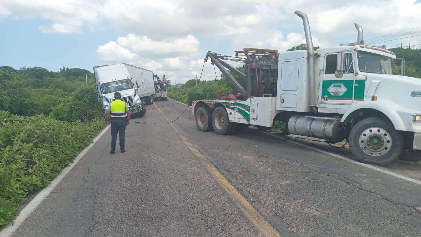 El cansancio originó que el chofer de un tráiler que circulaba por la carretera libre Mazatlán-Culiacán, terminara desbarrancado fuera de la carpeta asfáltica en el kilómetro 12 de la México 15.