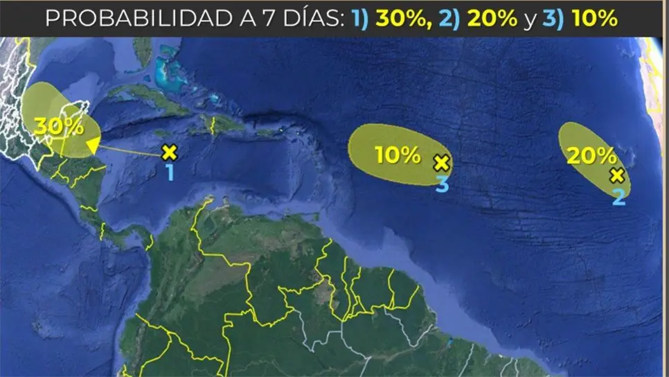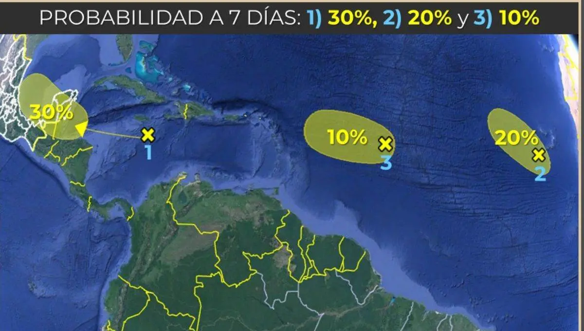 -La primera y la más cercana a México se encuentra asociada con una onda tropical, sobre el Mar Caribe, con el 30% de probabilidad de desarrollo ciclónico para los próximos 7 días. Se ubica a mil 230 km al este-suroeste de Quintana Roo.
