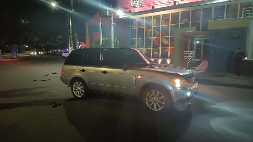 La camioneta Range Rover quedó con las luces encendidas y uno de los neumáticos reventados, además con daños en el costado izquierdo de la carrocería por el choque y un impacto de bala en la puerta trasera del lado derecho.