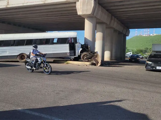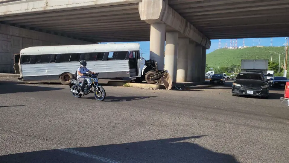 Un camión con 25 pasajeros de una empresa maquiladora se impactó contra un pilar del puente de desnivel ubicado en la Carretera Internacional México 15 y el bulevar Macario Gaxiola, al norte de Los Mochis, la mañana de este lunes.