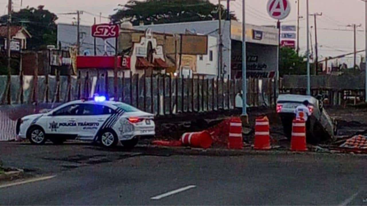 El conductor de un Chevrolet Aveo en color gris terminó volcado en medio de la construcción del paso a desnivel en los cruces del libramiento Luis Donaldo Colosio y Munich.