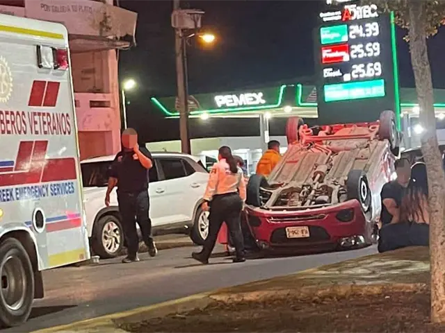 Ahí, un vehículo en color rojo quedó volcado en medio de la vialidad luego de que el conductor perdiera el control del volante cuando circulaba en dirección hacia la zona del centro.