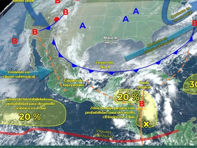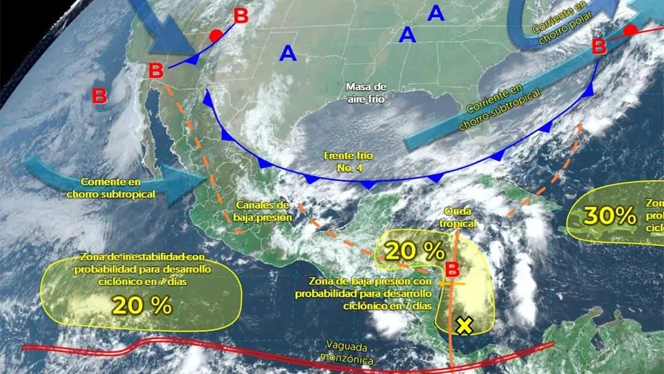 Esto, debido al Frente Frío 4 un canal de baja presión, la onda tropical número 27 y una zona de baja presión con posibilidad de desarrollo ciclónico.