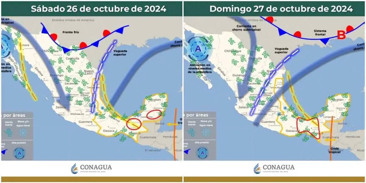 A nivel nacional, los efectos del canal de baja presión y una vaguada en niveles altos generarán fuertes precipitaciones en el sureste del país, con lluvias intensas de hasta 150 mm en Tabasco, Chiapas, Campeche y Quintana Roo, y lluvias puntuales muy fuertes en Oaxaca, Veracruz y Yucatán. En el noreste y centro de México, se esperan lluvias fuertes y chubascos acompañados de descargas eléctricas y posibles granizadas, en especial en Guerrero y Michoacán.