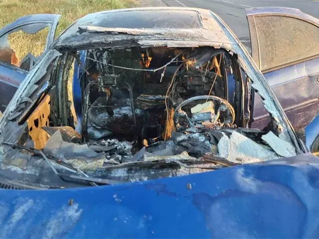 Un carro quedó destruido durante un incendio que se dio sobre el Trébol del campo El Diez, en la zona sur de Culiacán, Sinaloa.