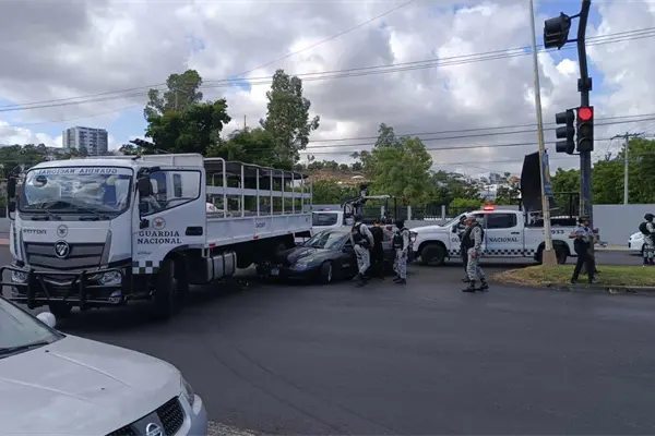 El conductor de un automóvil Honda Accord negro circulado del norte a sur sobre la citada avenida y al llegar al semáforo que se encuentra en el cruce con la calle Cerro Monte largo se impactó en el costado izquierdo de un camión de la Guardia Nacional.