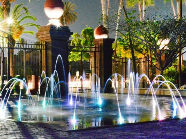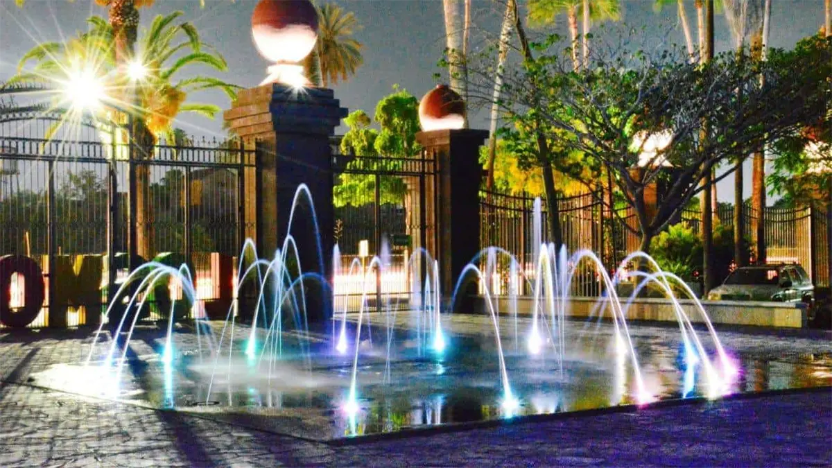 Durante las noches, la fuente se ilumina de múltiples colores para ofrecer un espectáculo visual a los visitantes