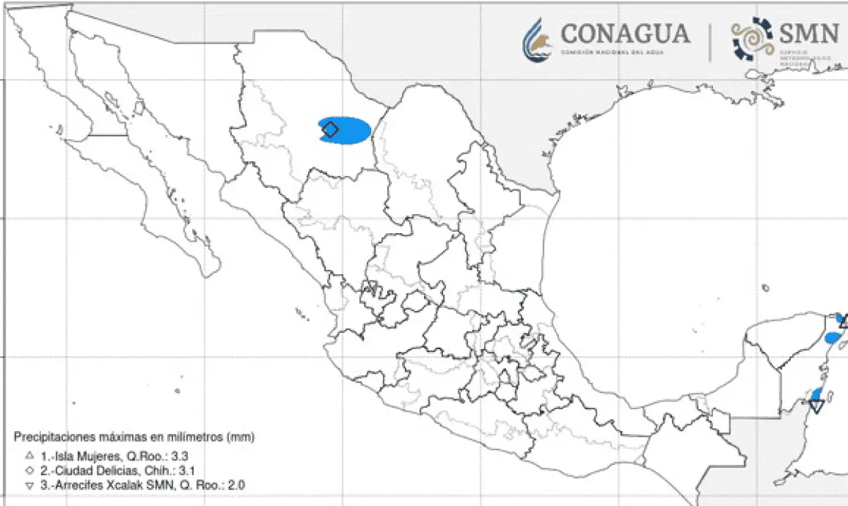 Finalmente, una circulación anticiclónica en niveles medios de la atmósfera mantendrá el tiempo estable en gran parte de la República Mexicana, cielo despejado y temperaturas de 35 a 40 °C en zonas de Sinaloa, Nayarit, Jalisco, Colima, Michoacán, Guerrero, Oaxaca, Chiapas y Campeche.