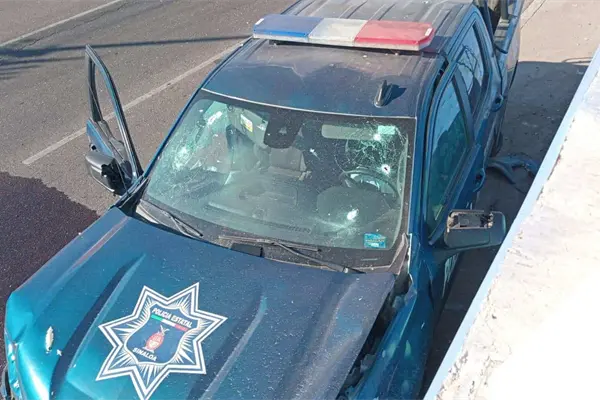 - La patrulla 302A terminó impactada contra el muro del puente que conduce al Aeropuerto Internacional de Culiacán, con 9 balazos en el parabrisas.
