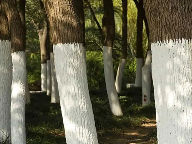Pintar los árboles de blanco es una técnica que se llama encalado, y tiene beneficios para la proyección de los árboles. Una de las funciones de esto, es que el color blanco refleja la radiación solar, lo que evita que la corteza del árbol se queme.