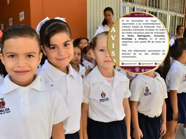 “Al no representar un riesgo y en seguimiento a las recomendaciones del Instituto Estatal de Protección Civil, se reanudan actividades escolares en todos los niveles educativos para los municipios de Choix, Badiraguato, Concordia, Escuinapa y Rosario, en el turno vespertino, este jueves 09 de enero de 2025”, comentó.