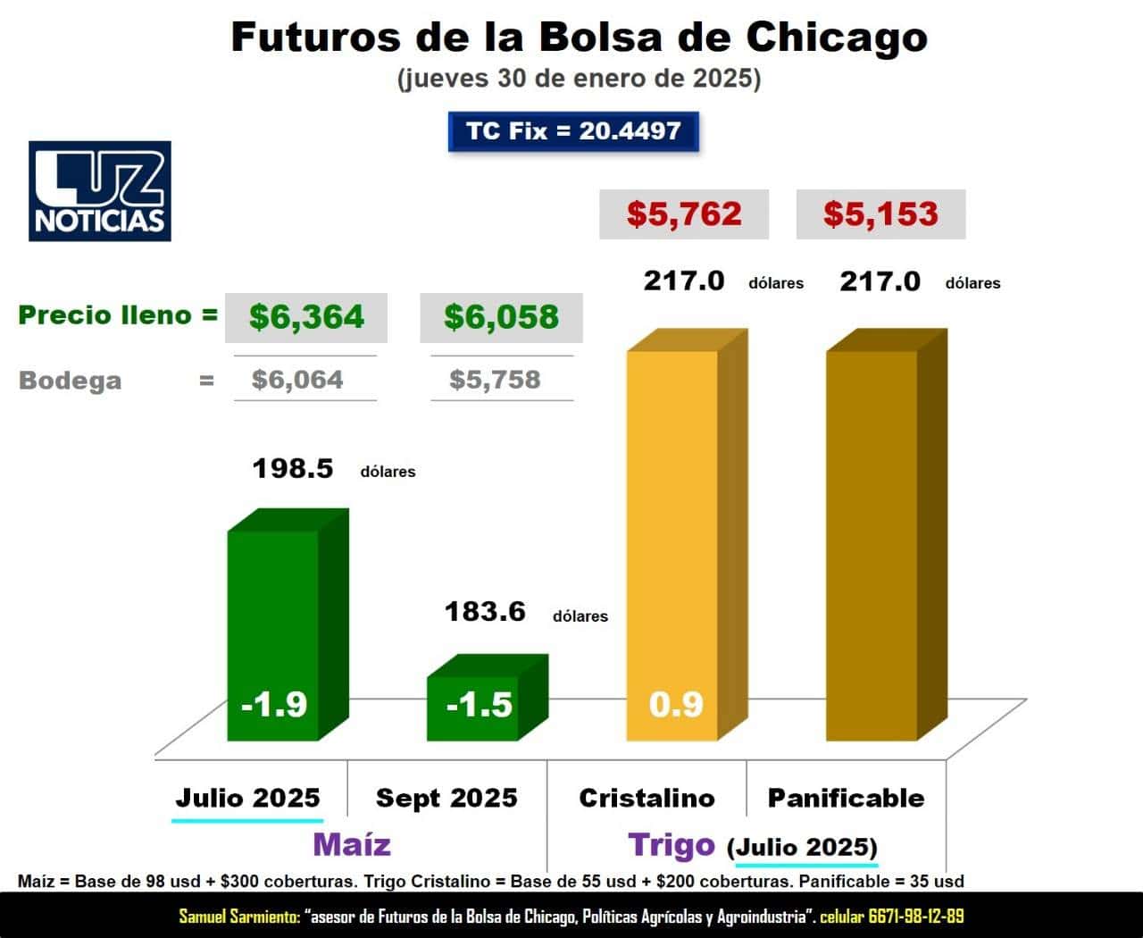 Los futuros de maíz con vencimiento en julio de 2025 registraron una pérdida de 1.9 dólares, situándose en 198.5 dólares por tonelada. Esto equivale a un precio en bodega de $6,064 por tonelada de maíz, que, sumado al apoyo que se anunció por el Gobierno Federal de $300 por coberturas, da un precio total de $6,364 por tonelada.