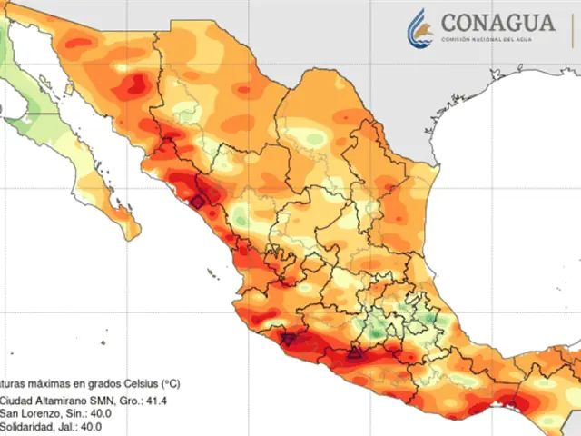 - Temperaturas máximas 35 a 40 °C: Sonora (sur), Chihuahua (suroeste), Durango (occidente), Sinaloa, Nayarit, Jalisco, Colima, Morelos, Puebla (suroeste) y Chiapas.