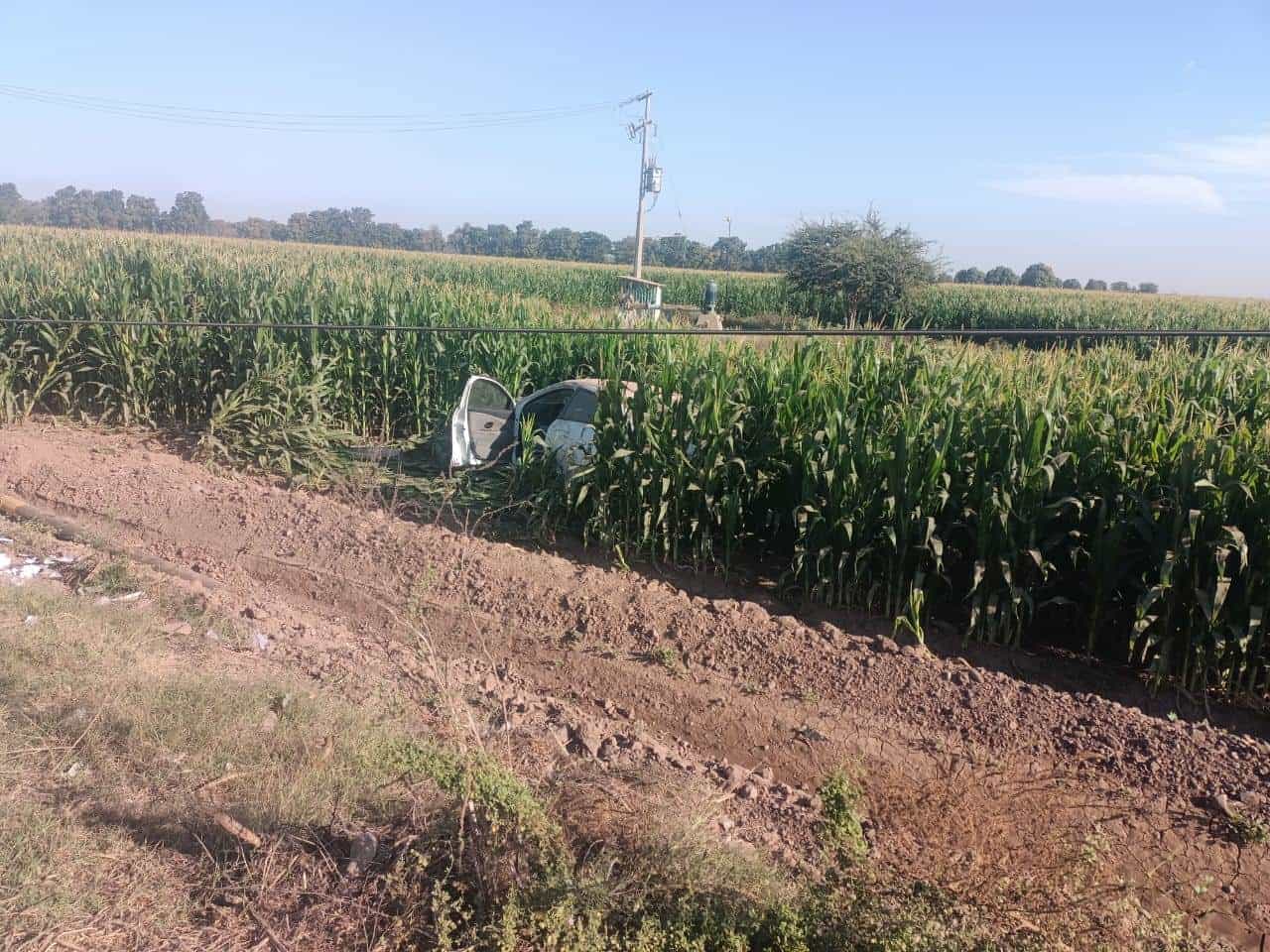 Pero en antes de llegar al canal 27 perdió el control del volante y se salió de la carretera estatal, luego brincó un canalito riego y terminó dentro de unas parcela sembradas de maíz.