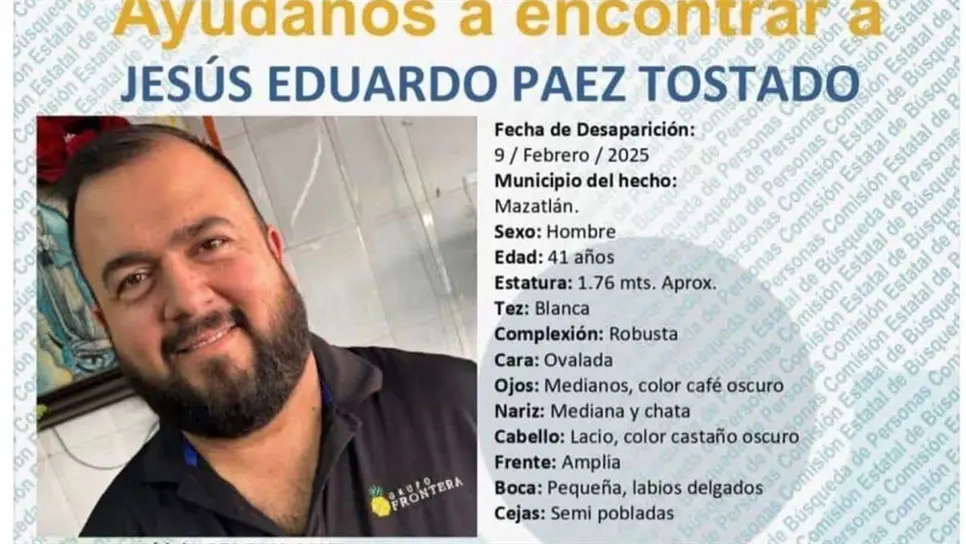Familiares de Jesús Eduardo Páez Tostado, de 41 años, solicitan ayuda para dar con su paradero luego de que desapareciera en Mazatlán el pasado 9 de febrero.