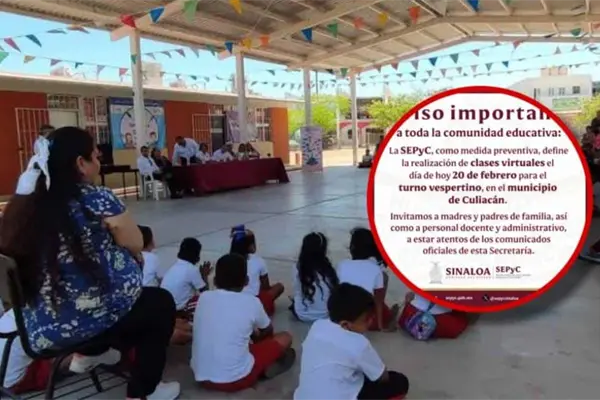 La Secretaría de Educación Pública y Cultura (SEPyC) anunció que las clases en el turno vespertino de este jueves 20 de febrero se llevarán a cabo de manera virtual en Culiacán. Esta decisión se tomó como una medida preventiva, por lo que se exhorta a la comunidad educativa a mantenerse atenta a los comunicados oficiales.