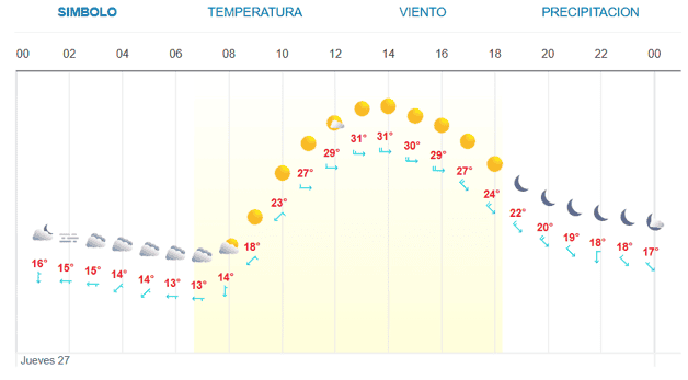 Las temperaturas oscilarán entre los 13°C y los 32°C, alcanzando su punto máximo alrededor de las 14:00 horas.