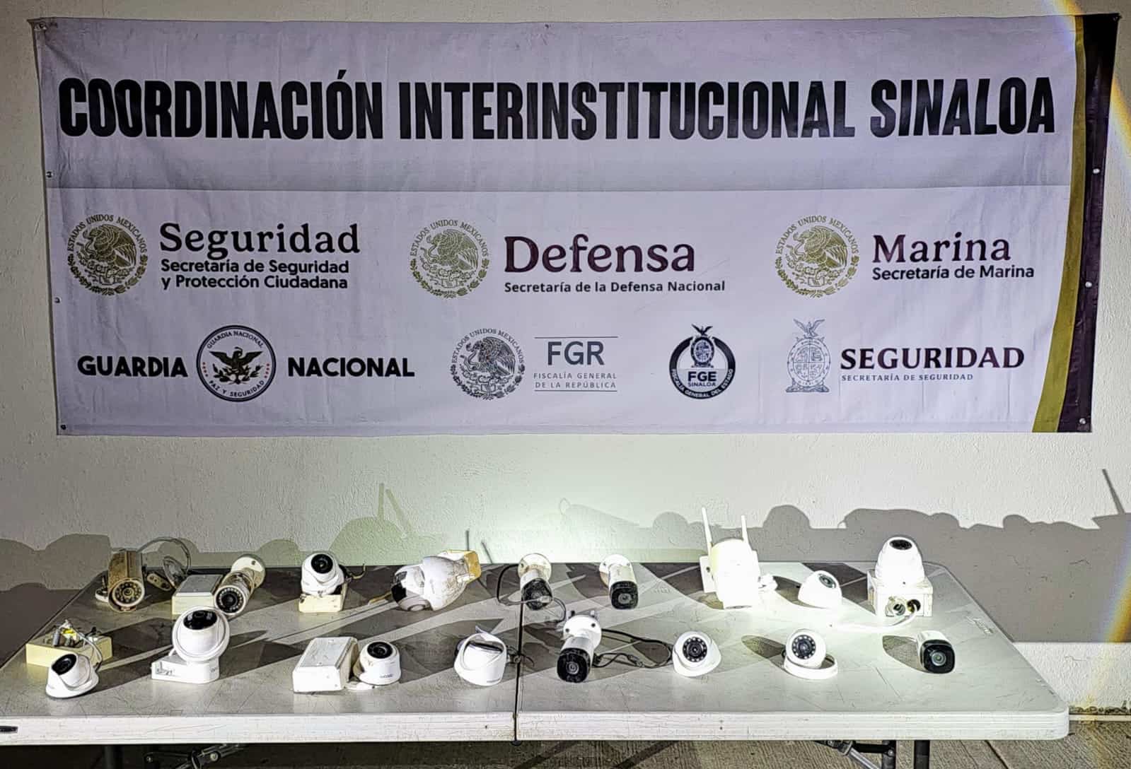 Elementos del Grupo Interinstitucional aseguraron 17 cámaras de videovigilancia que se encontraban instaladas irregularmente por particulares en un operativo en la sindicatura de Villa Juárez, municipio de Navolato.