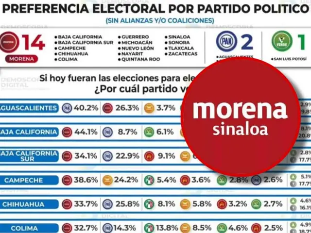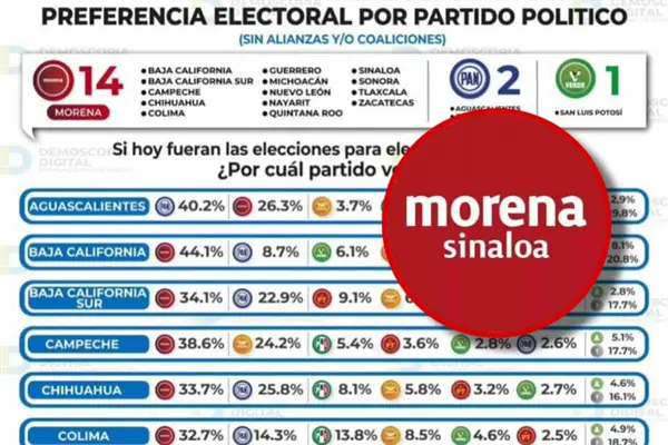 Morena en Sinaloa, con un 43.1%, se coloca en el tercer lugar a nivel nacional de preferencia y aprobación electoral, solo por debajo de Guerrero con 46.5% y Baja California, quien cuenta con el 44.1% de aprobación.