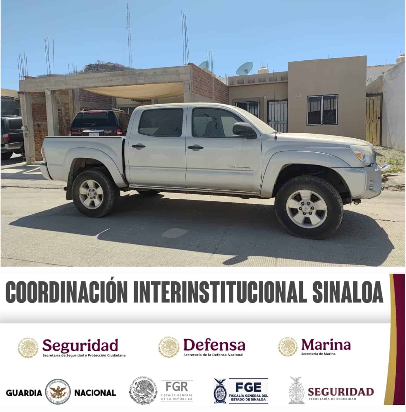 Se indicó que los elementos de la Secretaría de Seguridad Pública del Estado, a través de la Policía Estatal Preventiva, en coordinación con la Secretaría de la Defensa Nacional, la Guardia Nacional, la Secretaría de Marina, la Fiscalía General de la República y la Fiscalía General del Estado, recuperaron en Culiacán una camioneta que tenía denuncia por robo en la unidad americana.