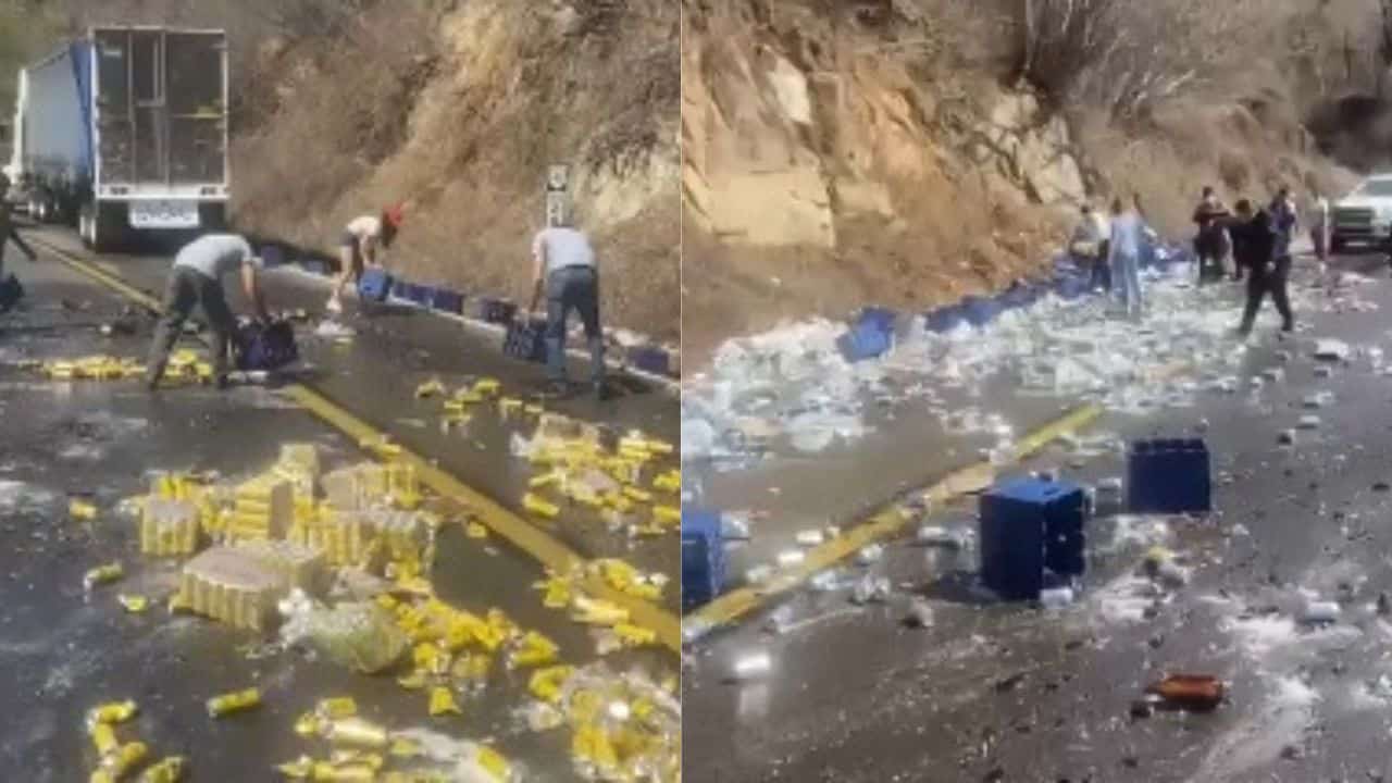 La tarde de este viernes se registró una contingencia vial sobre la carretera Malpica-Concordia, luego de que un tráiler cargado con cerveza volcara, dejando su mercancía esparcida en ambos carriles.