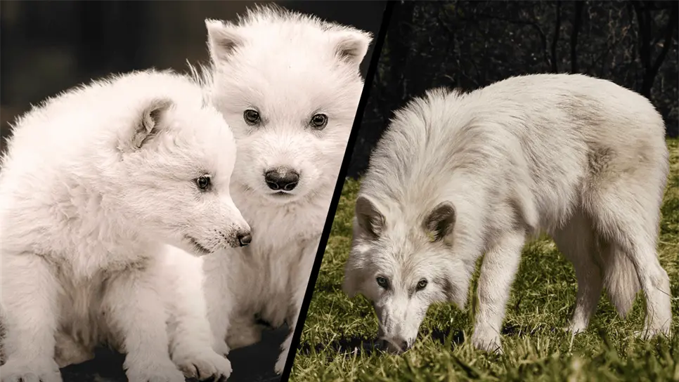 A pesar de su corta edad (seis meses para los machos), los lobos ya impresionan por su tamaño y apariencia. Miden cerca de 1.20 metros de largo, pesan más de 36 kg y lucen un distintivo pelaje blanco puro. Se proyecta que en su adultez alcancen hasta 1.80 metros de longitud y un peso cercano a los 70 kg.
