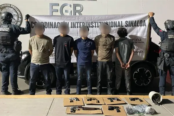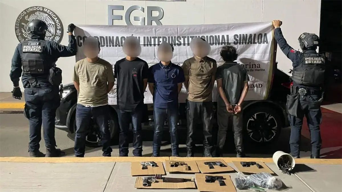 Elementos del grupo interinstitucional detuvieron a cinco hombres a quienes les aseguraron armas, cargadores, cartuchos, un vehículo y otros objetos relacionados con delitos en el fraccionamiento Los Huertos al norte de Culiacán.